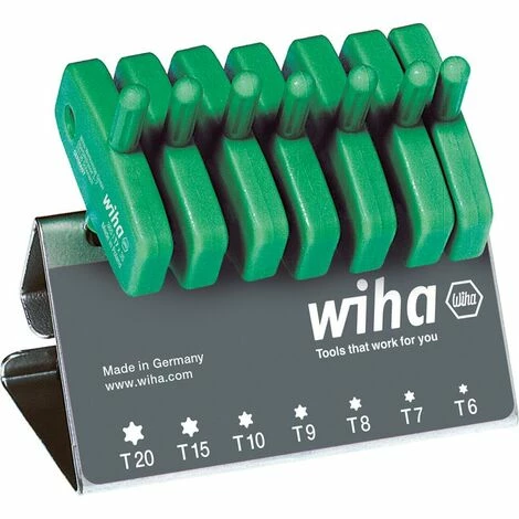 Schraubendreher-Satz mit Schlüsselgriff für TORX® Ausführung: Klinge aus Chrom-Vanadium-Stahl, durchgehend gehärtet und brüniert, mit Schlüsselgriff. Lieferung im Werkstattständer mit Abtriebsymbolen in Originalgröße. Anwendung: Für hohe Drehmomente bei kleinen Schraubenabmessungen, speziell beim Wechseln von Wendeschneidplatten an Messerköpfen. Lieferung im Werkstattständer mit Abtriebsymbolen in Originalgröße. Eigenschaft: Ausführung:7-teilig |Satzinhalt:T 6; 7; 8; 9; 10; 15; 20 |Marke:Wiha |WGNr.:W530 |