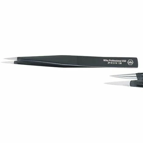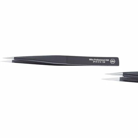 Anwendung: Universalpinzette für alle gängigen Anwendungen in der Elektronik. · Ausführung: Glatte Greifflächen, Griffflächen ohne Riefen. Blendfrei schwarz beschichtet, antistatisch. Antimagnetisch und säurebeständig. Oberflächenwiderstand 10^6 – 10^9 Ohm. · Normen: IEC 61340-5-1. · Werkstoff: Speziell legierter, rostfreier