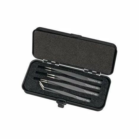 Handbestückung von Leiterplatten mit SMD-Bauteilen oder Nacharbeitstätigkeiten. Ausfuehrung: ESD-Werkzeuge gefertigt nach IEC 61340-5-1.Alle Pinzetten sind ESD-safe (antistatisch) durch spezielle ESD-Beschichtung, säurebeständig, rostfrei und 100% anti-magnetisch.Oberflächenwiderstand 10^6 – 10^9 Ohm. Inhalt: Universalpinzette, spitze Form, 130 mm (Serie ZP 01 0 14)Päzisionspinzette, eckig-breite Spitze, 130 mm (Serie ZP 07 1 14)SMD-Pinzette, flache Greifflächen, 120 mm (Serie ZP 25 2 14)SMD-Pinzette, Greiffläche mit Radius, 117 mm (Serie ZP 50 0 14) Koffer: Keine Gefährdung elektronischer Komponenten durch Verwendung von EGB-sicheren Materialien.Robuste und platzsparende