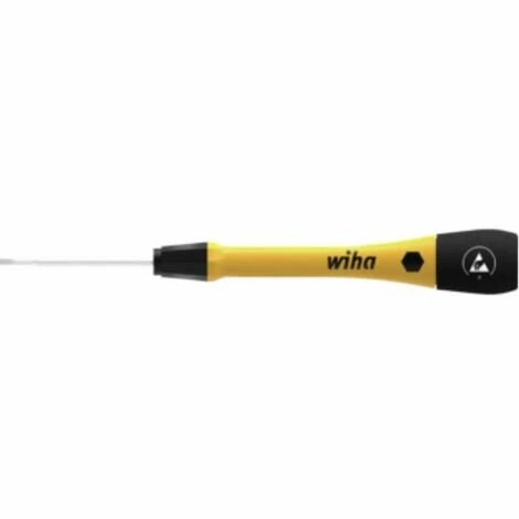 Schlitz-Schraubendreher ESD mit Feinschraubgriff, 1,5 -4,0 mm Schneidenbreite • Anwendung: Für Arbeiten an elektrostatisch gefährdeten Bauteilen (IEC 61340-5-1). • Ausführung: Klinge aus hochlegiertem Chrom-Vanadium-Molybdän-Stahl – durchgehend gehärtet – mattverchromt – Spitze Wiha-Chromtop® – Feinschraubgriff mit Drehkappe aus schlagfestem Kunststoff