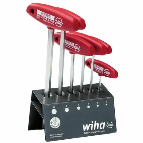 Sechskant-Schraubendreher-Satz mit Magic-Ring® • Ausführung: mit QuergriffKlinge aus Chrom-Vanadium-Stahlglanzvernickelt • Vorteil: hohe Haltekraft durch stabilen. verschleißfestem Federstahlringerleichtert das Herausheben von versenkten Schrauben sowie das Einführen in schräge oder tiefe Sacklöchergeeignet für Edelstahl-. Messing- oder andere nichtmagnetische Schrauben • Lieferung: mit Werkstattständer