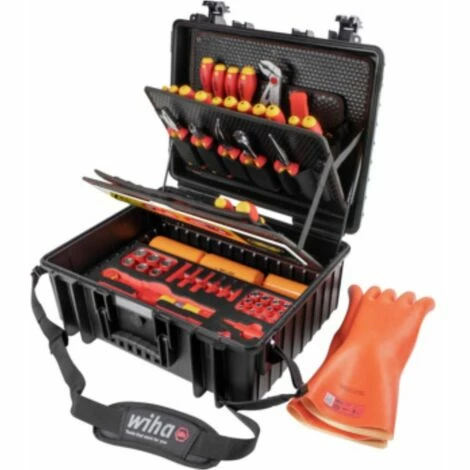 Werkzeugkoffer Set XL eMobility Bestückt mit 77 Werkzeugen gemischt • Ausführung: Hochschlagfester ABS Schalen-Werkzeugkoffer, extrem robust – Die komplette Ausstattung für e-Mobility Anwender inklusive Arbeitsschutz – VDE Werkzeuge isoliert und Stückgeprüft nach DIN EN 60900 – Bodenschale mit Schaumeinlage-alle Werkzeuge sicher und übersichtlich untergebracht. • Lieferung: