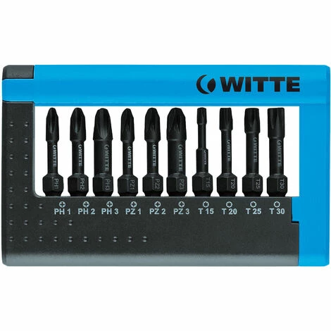 Die Box enthält 10 WITTE IMPACT Bits mit einer Länge von 38mm und einem Sechskantantrieb 1/4″.