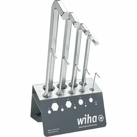 Winkelschraubendreher-Satz für Sechskant, lang, im Werkstattständer Ausführung: DIN 911 L, ISO 2936 L. Aus Chrom-Vanadium-Stahl, durchgehend gehärtet und glanzvernickelt. Schlüsselenden gefast. Ab Schlüsselweite 3 mm mit Schlüsselweite, ISO und Werkstoff gekennzeichnet. Lieferung im Werkstattständer. Eigenschaft: Ausführung:9-teilig |Satzinhalt:2,5; 3; 4; 5; 6; 8; 10; 12; 14 mm|Marke:Wiha |WGNr.:W530 |